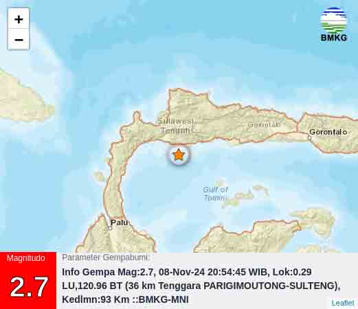 GEMPABUMI berkekuatan magnitudo 2,7 terjadi di wilayah Sulawesi Tengah, Jumat (8/11/2024) pukul 21.54 WITA.
