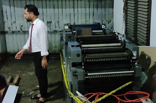 MESIN CETAK UANG PALSU. Petugas berada di dekat mesin cetak uang palsu yang ditemukan di kampus Universitas Islam Negeri (UIN) Alauddin Makassar, Kabupaten Gowa, Sulawesi Selatan, Senin (16/12/2024). Foto: CNN Indonesia