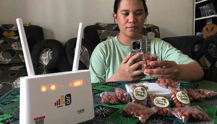 Lilis Papoiwo (26) memperlihatkan kacang disko hasil produksinya dengan perangkat Indosat HiFi Air yang digunakannya mengakses internet saat berjualan online di rumah Kelurahan Pengawu, Kecamatan Tatanga, Kota Palu, Sulawesi Tengah, Senin (11/8/2025). Foto: Taufan Bustan/Eranesia.id