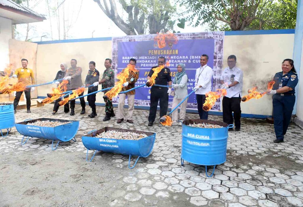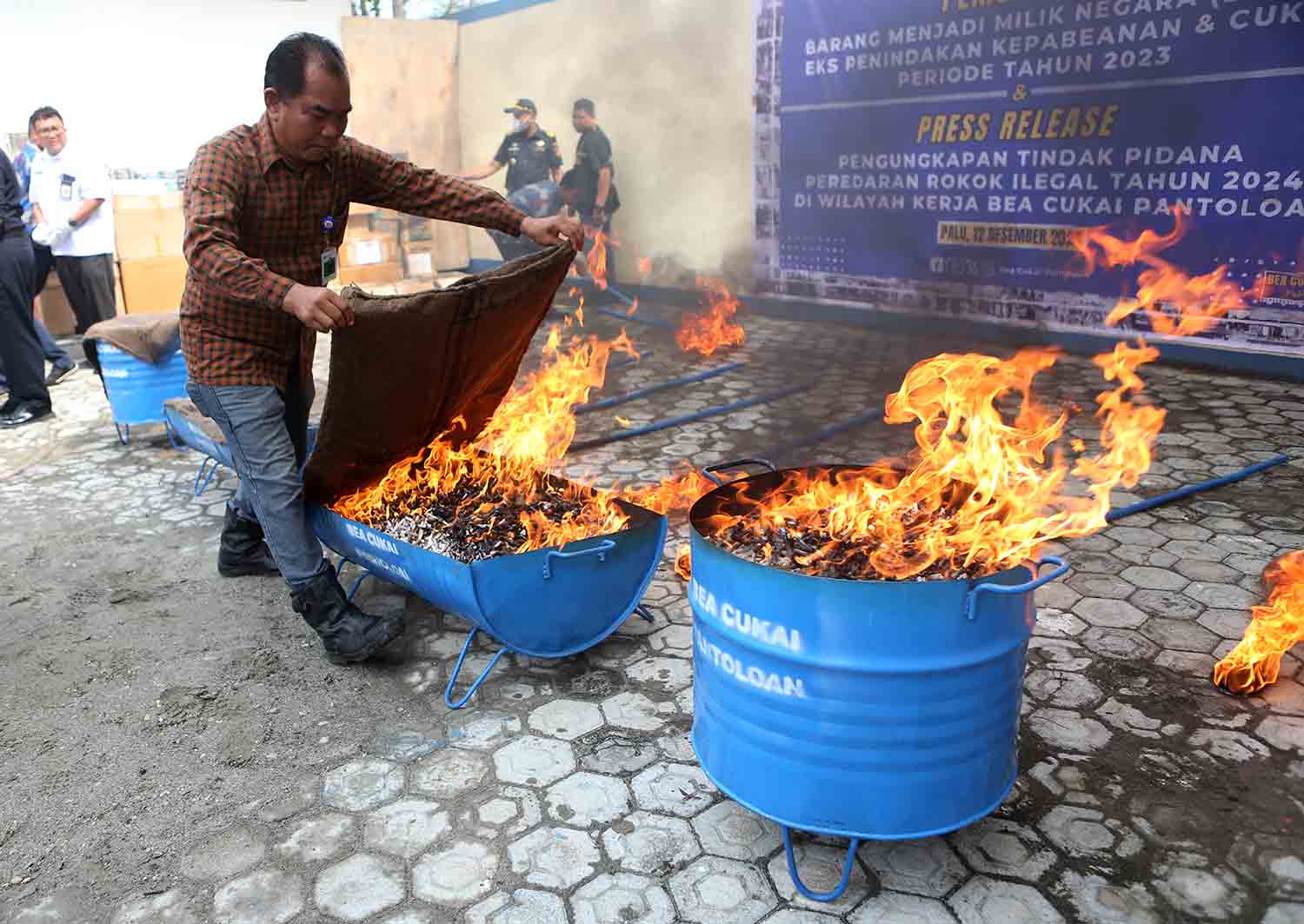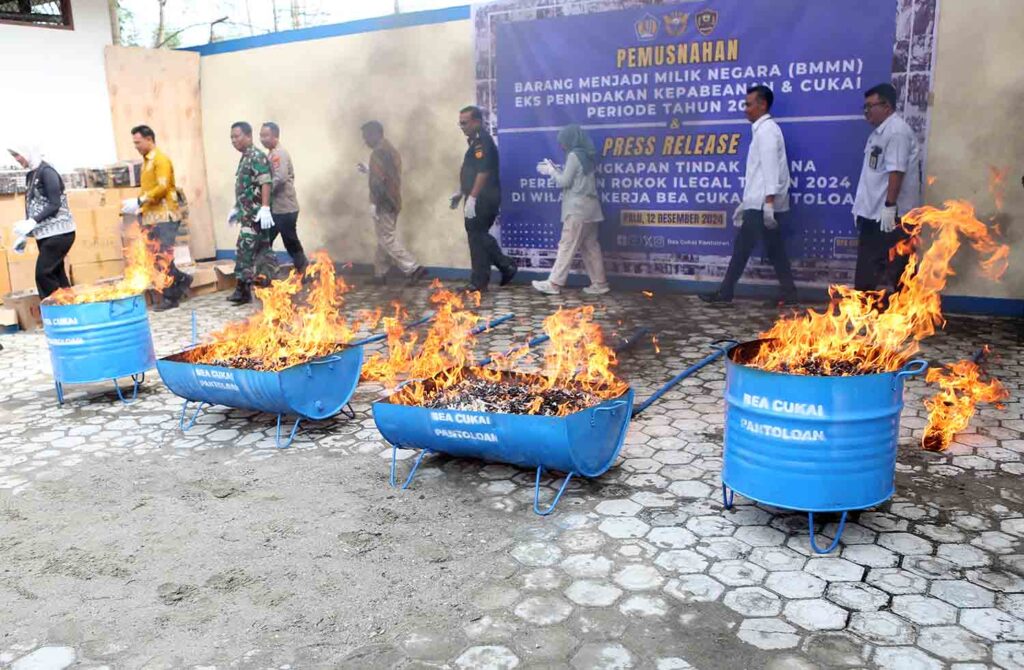 Kepala Kantor Pengawasan dan Pelayanan Bea dan Cukai (KPPBC) Tipe Madya Pabean C Pantoloan, Palu, Krisna Wardhana (lima dari kanan) bersama tamu undangan memusnakan rokok ilegal dengan cara dibakar di halaman belakang KPPBC Pantoloan Palu, Sulawesi Tengah, Kamis (12/12/2024). KPPBC Tipe Madya Pabean C Pantoloan memusnakan Barang Milik Negara (BMN) hasil penindakan kepabeanan dan cukai sepanjang tahun 2023. Pemusnahan ini dengan nilai barang mencapai Rp256.259.050. Barang ilegal yang dimusnahkan meliputi 199.570 batang rokok ilegal dari pelbagai merek, termasuk rokok tanpa pita cukai, rokok dengan pita cukai palsu, bekas, atau berbeda. Selain itu, turut dimusnahkan 188 botol minuman beralkohol ilegal. Foto: Taufan Bustan/Eranesia.id