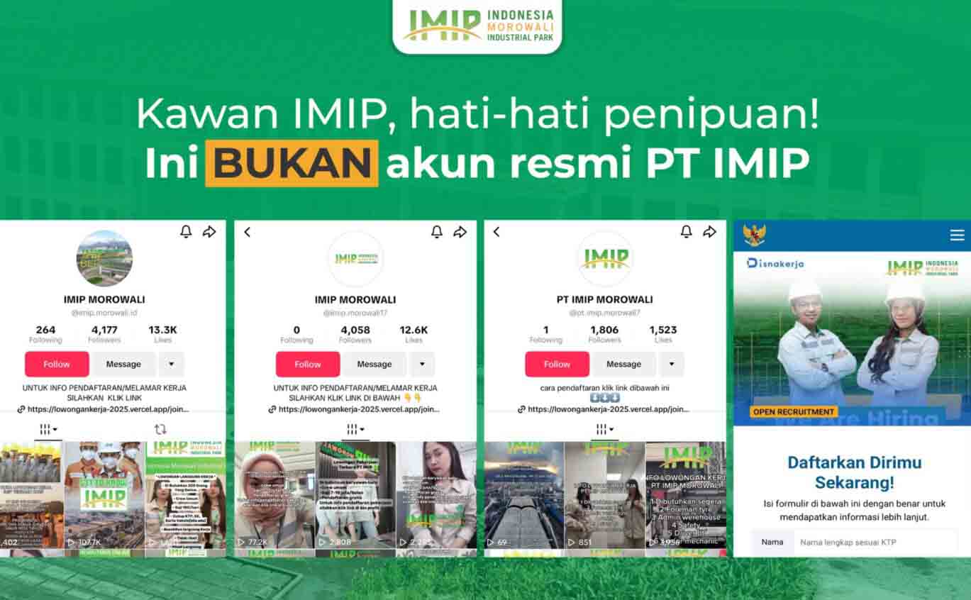 Sejumlah akun media sosial seperti @imip.morowali.id, @imip.morowali17, @pt.imip.morowali7, dan @hotel.pt.imip mengunggah lowongan kerja palsu yang mengatasnamakan PT IMIP.