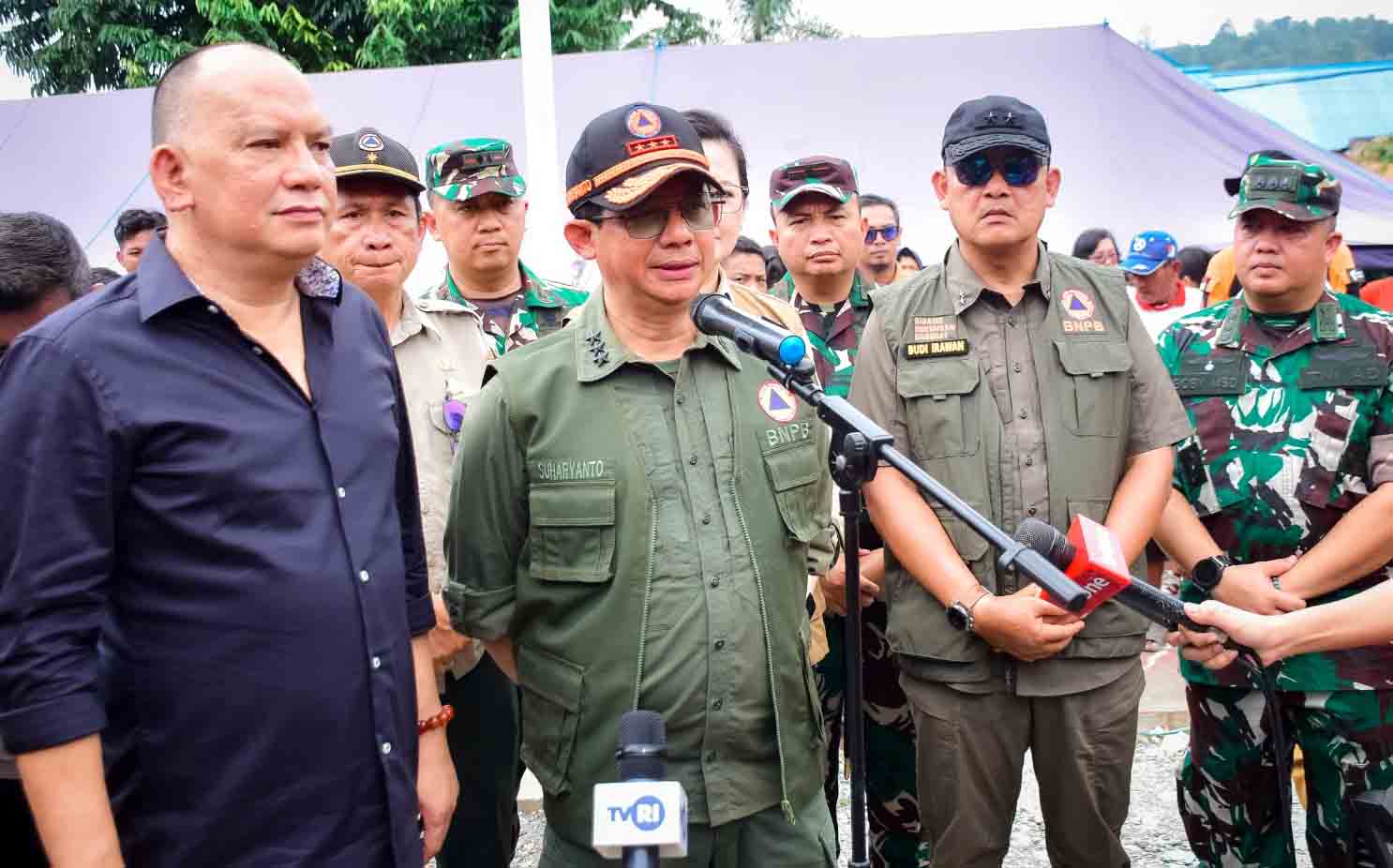 Kepala BNPB Letjen TNI, Suharyanto didampingi rombongan menjawab pertanyaan sejumlah jurnalis seusai meninjau lokasi bencana gempa bumi di Kabupaten Poso, Sulawesi Tengah, Selasa (19/8/2025). Foto: HO